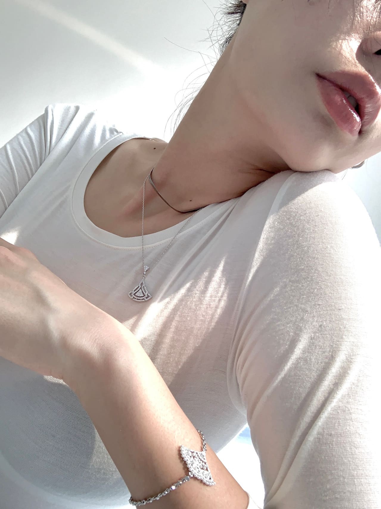 赵丽颖微微低头颌首,眼眸中流转着温柔而笃定的光,蓝色长裙的褶皱在胸前形成优雅的纹理,静谧中散发着内敛的力量。